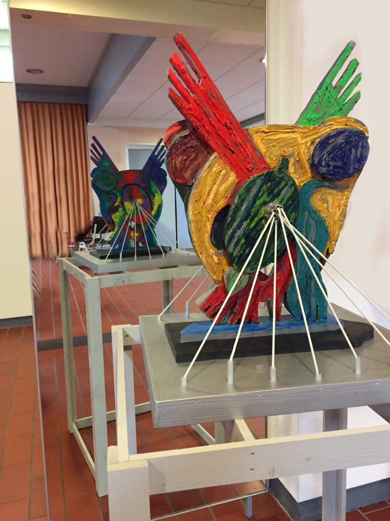 Kleuren zijn prominent in vrijwel al mijn schilderijen en ruimtelijk werk aanwezig. Ik vind het heerlijk om ‘kleurrijk te creëren’. Het is fascinerend om tot overeenstemming te komen tussen kleurrijke vlakken / vormen en alle mogelijkheden die de materialen mij bieden. Dit zowel op doek / paneel, als door mij zelf gevormde stukken hout. (ruimtelijk werk, 3 dimensionaal). Na een eerste aanzet laat ik het onderwerp uitvoerig op me inwerken om er vervolgens stap voor stap meer invulling aan te geven. Zo ontstaat er een boeiende en spannende gelaagdheid. Je weet van te voren nooit in hoeveel fases het object af is. Ik gebruik voor mijn werk geregeld onderwerpen / elementen die me wezenlijk interesseren en bezighouden. Ik verken dan grondig het betreffende onderwerp, de voorstelling. Die zoektocht, (gelaagdheid) is boeiend, leerzaam en veelal intensief. Ik maak ook werk met basale figuratie of non figuratie, het levert een palet van kleurrijk gevarieerde objecten op.